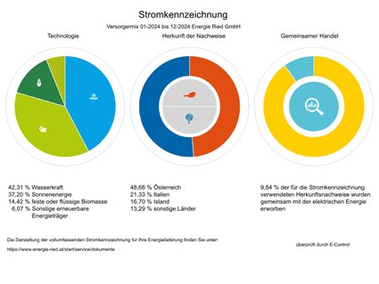 *Die Preisgarantie und Vertragsbindung auf die Zonenarbeitspreise und den Grundpreis gilt bis 30.04.2026. Voraussetzung fĂŒr diesen Tarif ist ein Smart Meter, der den Energieverbrauch in ÂŒ-Stunden-Werten erfasst. Sollten keine ÂŒ-Stunden-Verbrauchswerte zur VerfĂŒgung stehen, werden die Verbrauchswerte (z.B. Tagesverbrauchswerte) mittels des lt. Netzbetreiber zugeordneten synthetischen Lastprofils aufgeteilt und fĂŒr die Verrechnung herangezogen. Angebot gĂŒltig fĂŒr Kunden bis zu einem maximalen Jahresverbrauch von 100.000 kWh bis auf Widerruf. Nicht enthalten sind die jeweils gĂŒltigen Systemnutzungstarife und Entgelte fĂŒr Messleistungen des Netzbetreibers sowie gesetzlich geregelte Steuern und Abgaben. Im Stadtgebiet Ried i. I. wird zusĂ€tzlich die Gebrauchsabgabe in der Höhe von 3 % der Energiekosten verrechnet. Preisinformationsblatt Stand 06/2025, vorbehaltlich etwaiger Druckfehler und Ănderungen. Es gelten die âAllgemeinen Bedingungen fĂŒr die Lieferung von elektrischer Energie fĂŒr Kunden der Energie Ried GmbHâ, einzusehen unter www.energie-ried.at. Energie Ried Kundencenter, Hauptplatz 18, 4910 Ried im Innkreis, Tel.: 07752 911 160, E-Mail: vertrieb@energie-ried.at.